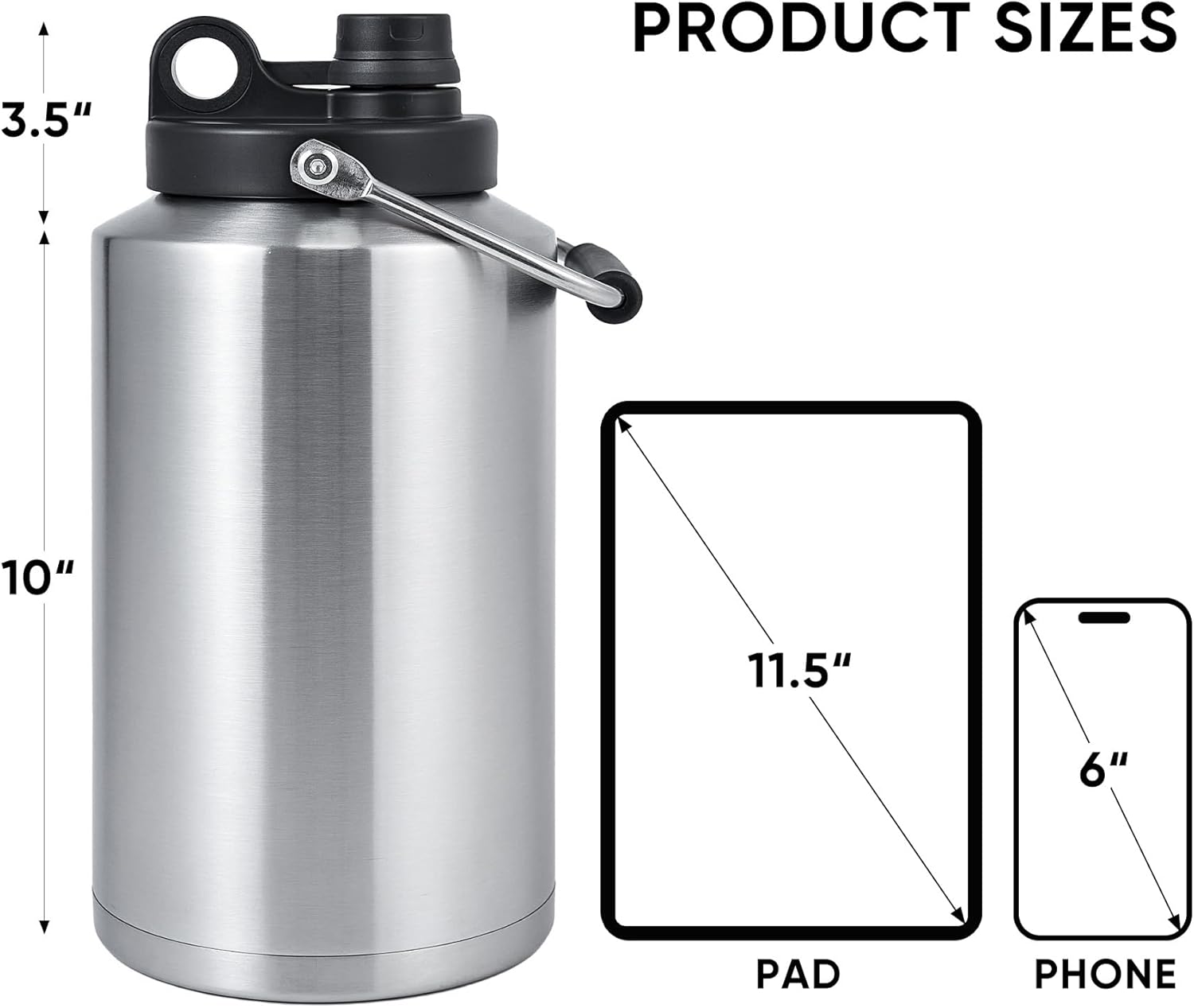 Insulated Gallon Jug with Handle, One Gallon, 128oz Stainless Steel, Large Double Vacuum Water Bottle for Hot & Cold Drinks, Wide Mouth, Sweat Proof, Great for Travel, Camping, Stainless